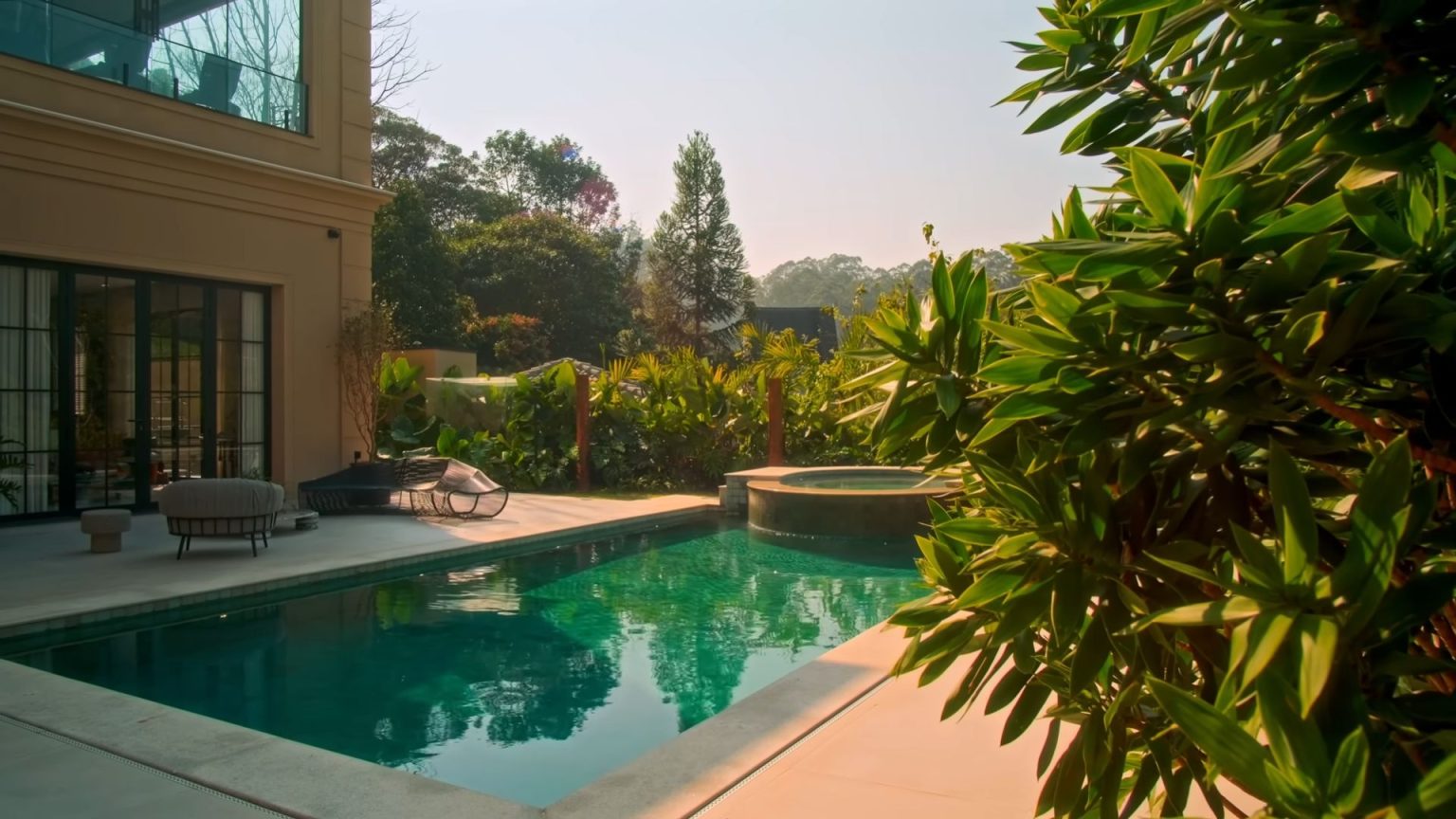 O projeto da casa, que inicialmente tinha 1.200 m², foi expandido para quase 1.800 m², provando que o artista não economizou na hora de garantir um lar funcional. A área externa, um diferencial decisivo na compra, inclui um jardim amplo, piscina e deck de madeira, promovendo o lazer em família.